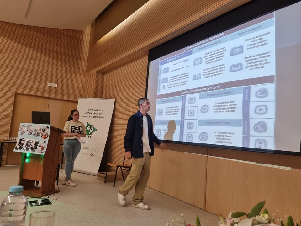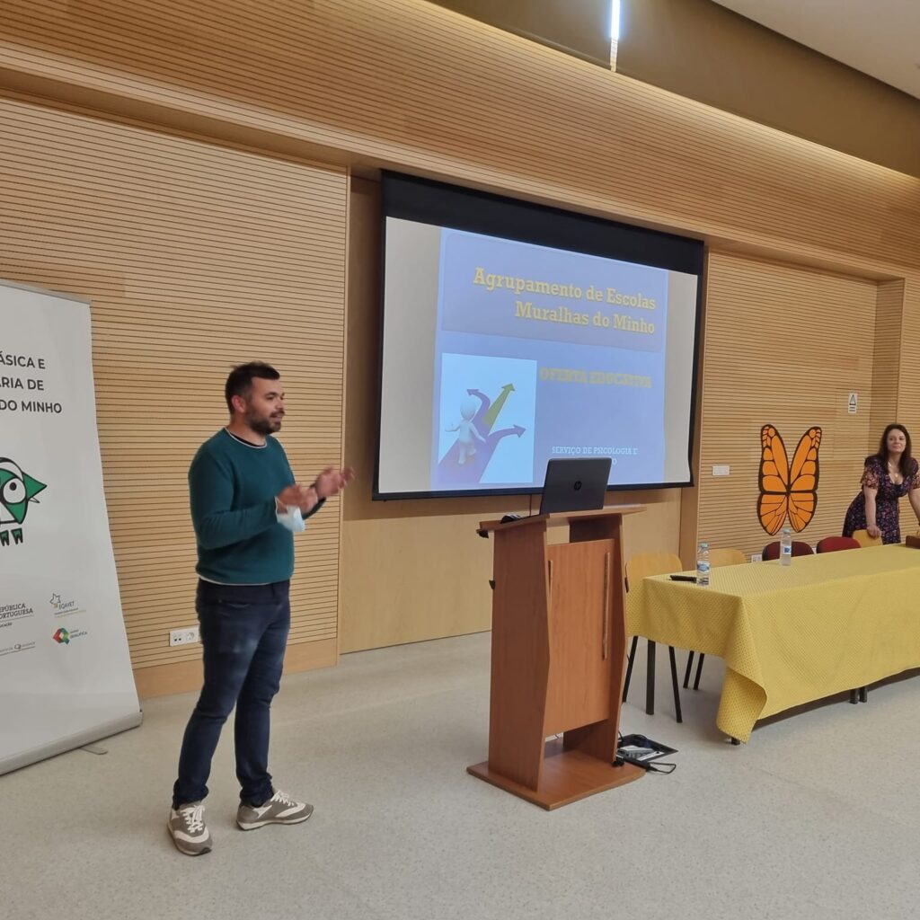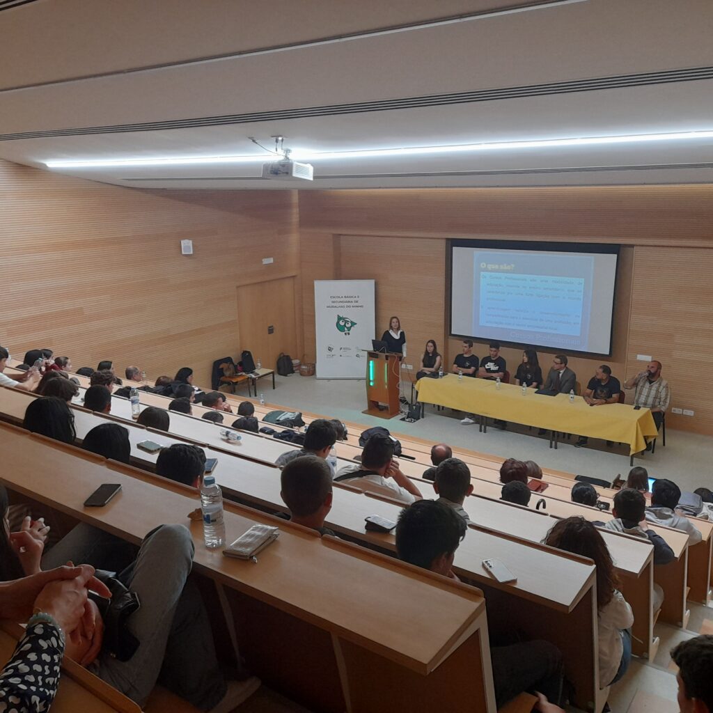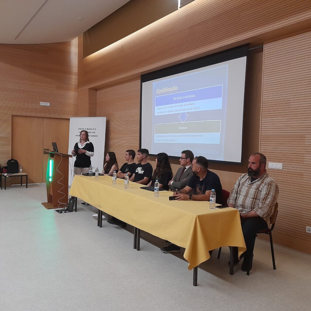 Cada interveniente partilhou o seu testemunho com os presentes a par da apresentação da oferta formativa dos cursos profissionais para o próximo ano letivo, a saber: Técnico(a) de Informática de Gestão, Técnico(a) de Auxiliar de Saúde, Técnico(a) de Eletrónica, Automação e Computadores e Técnico(a) de Logística; todos com uma elevada relevância na Região Norte ao nível da empregabilidade, de acordo com o estudo SANQ, realizado pela CIM-Alto Minho Região Norte. Na divulgação dos cursos profissionais informou-se que já se encontra disponível uma Ficha de Pré-Inscrição através do portal do agrupamento (https://forms.gle/hPTGDc1aNLcpje6s7) e do código QR, constante em cada cartaz de divulgação afixado na escola sede.