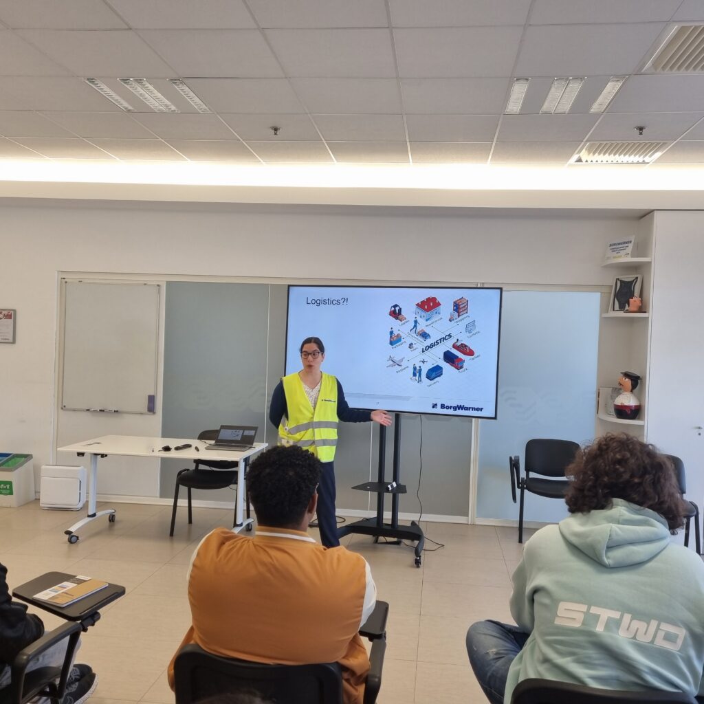 Já na receção da empresa BorgWarner, fomos recebidos pelo responsável dos Recursos Humanos, Dr.ª Sílvia Miranda e o Dr. º Luís Feijó e a sua equipa, que nos fez uma apresentação da empresa e nos deu os guias de visita, sendo o grupo subdividido em dois, por questões de segurança.